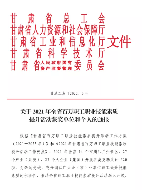1月21日,甘肃省总工会、省人力资源和社会保障厅、省工业和信息化厅、省科学技术厅、省人民政府国有资产监督管理委员会联合公布了《关于2021年全省百万职工职业技能素质提升活动获奖单位和个人的通报》,球王会体育集团专精特新公司孙占栋、刘恒、林占强、骆振玺、刘恒5名职工荣获“2021年甘肃省技术标兵”称号。